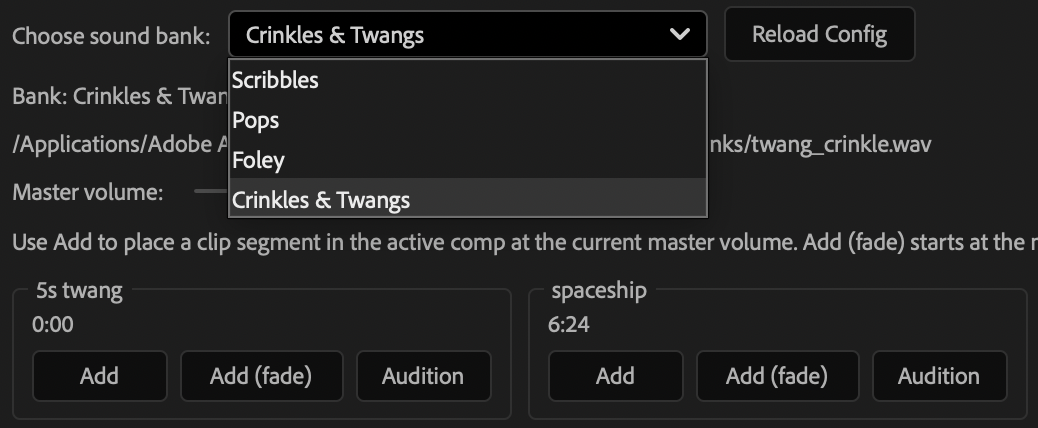 This plugin is a library of foley sounds that can be instantly added to a comp with the press of a button. 46 sounds are included (boings, twangs, pops, scribbles etc.) and the plugin can easily be extended by editing the config file.