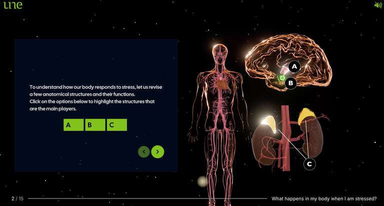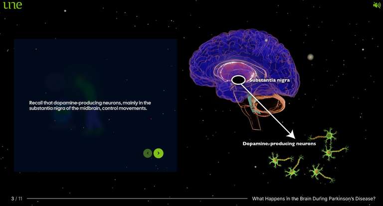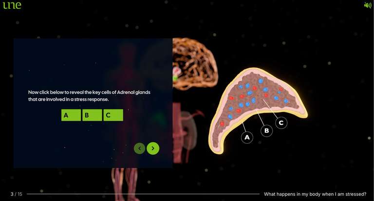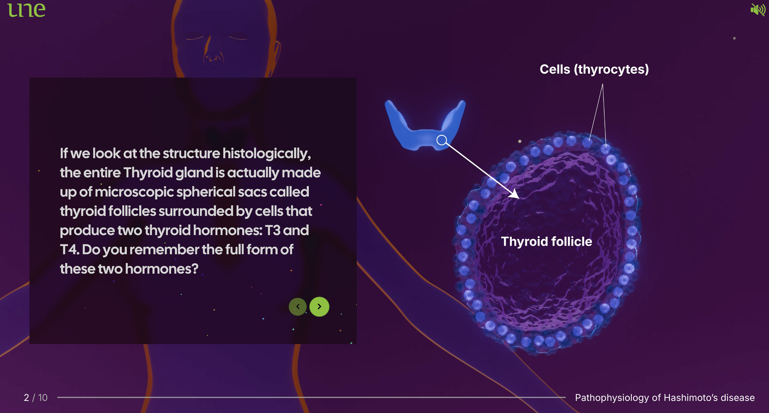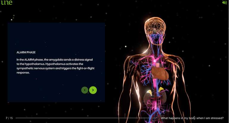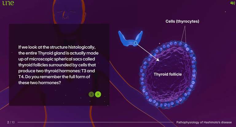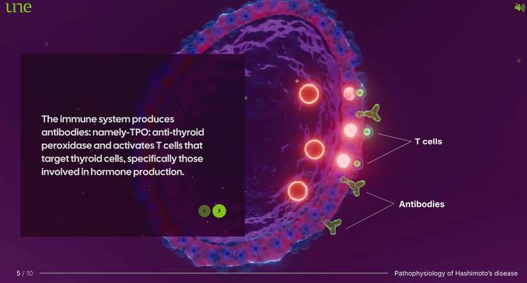 In 2025, the UNE Learning Media team collaborated with Mansi Dass Singh (Lecturer in Biomedical Science, School of Science and Technology) to create a series of interactive animations. The goal of these animations was to assist first-year biomedical science students in developing their understanding of key pathophysiological mechanisms observed in asthma, diabetes, Hashimoto’s disease, stress, Parkinson’s disease, and rheumatic heart disease.
