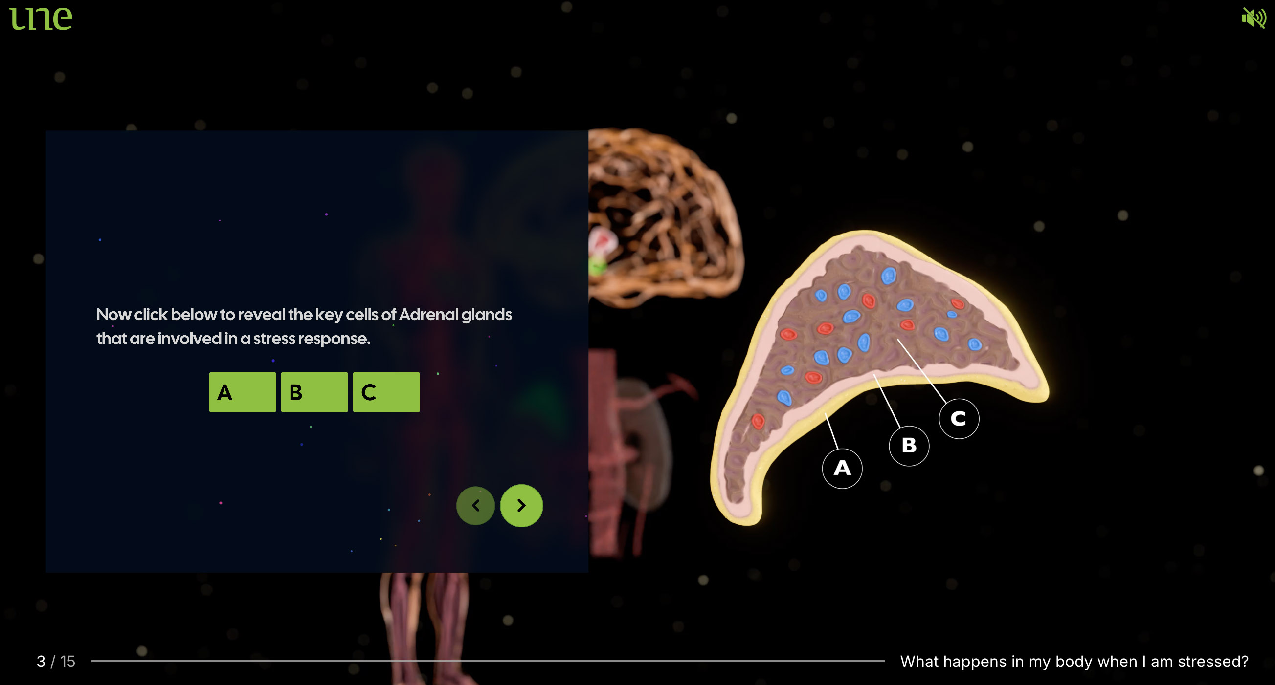 The interactive component was developed in Tumult Hype, supported by a custom code base that allowed us to control the video playhead position of the 3D animations and trigger tailored interactions at key points. These interactions gave students opportunities to reflect on their understanding before progressing, while also providing a convenient way to rewind and replay sections of the content as needed.